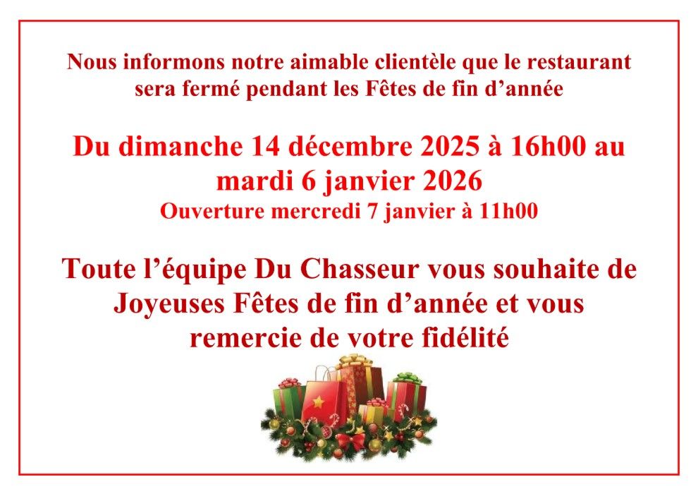 Fondée par deux restaurateurs passionnés dans une ancienne batisse plein de caractère, l'Auberge du Chasseur est un restaurant convivial et chaleureux oú vous degusterez des mets savoureux avec une équipe dynamique et attentive à vos besoins.
